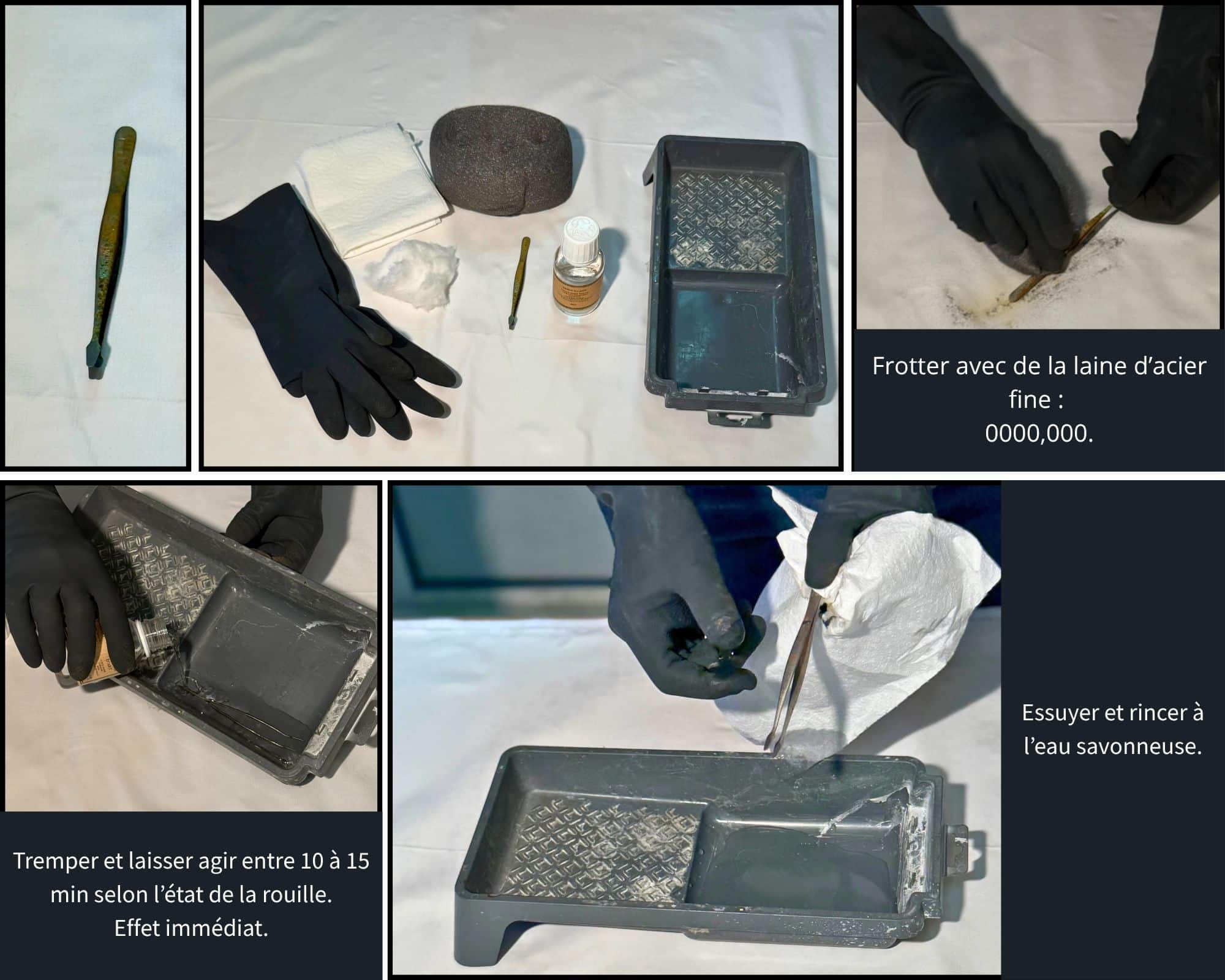 - Une fois que la rouille a disparu, rincer à l’eau et surtout sécher immédiatement avec un pistolet thermique ou un sèche-cheveux pour éviter que l’humidité fasse de nouveau rouiller la pièce.