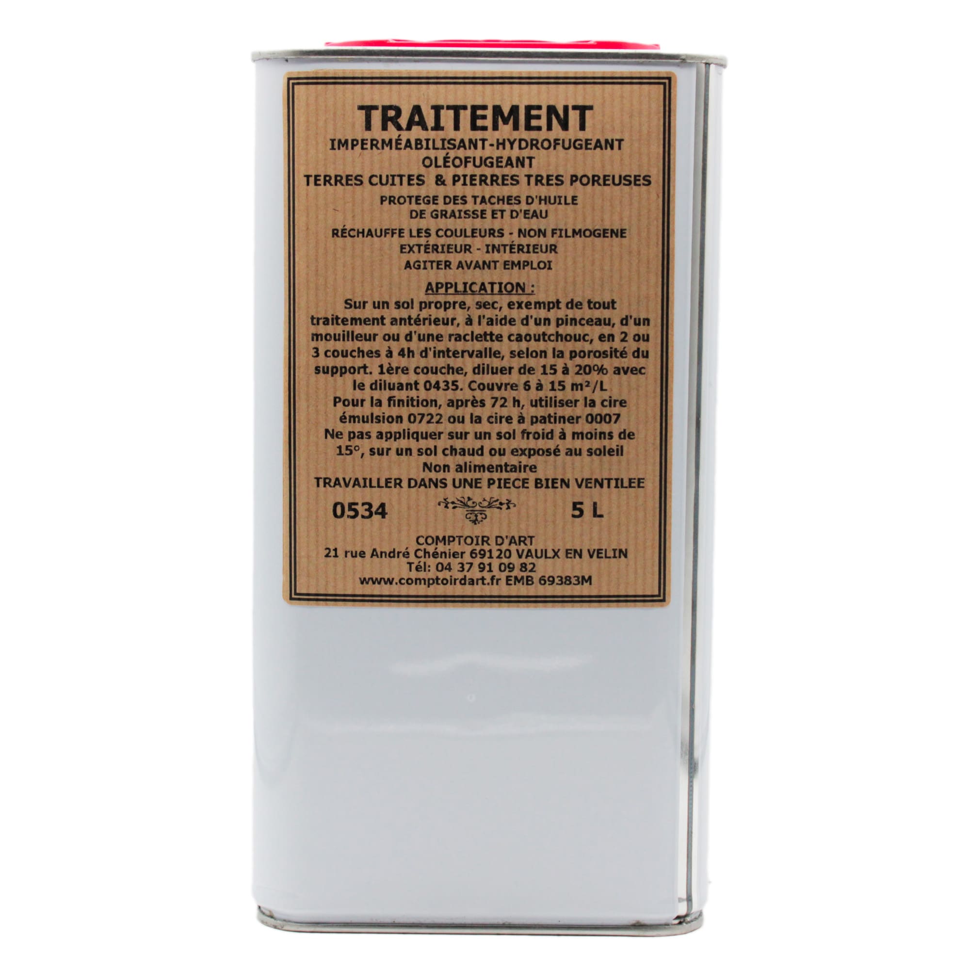 Ne pas utiliser à moins de 15°, sur un sol chaud ou exposé au soleil. Il s’applique en 2 ou 3 couches sur un sol neuf ou ancien propre et sec, ne comportant aucune trace d’autre traitement ce qui entraînerait une mauvaise pénétration et un mauvais séchage du produit. Lorsque les terres cuites sont moyennement poreuses et que le produit ne pénètre pas très bien  on peut le diluer avec le diluant actif  0435 qui permettra de régler la viscosité sans modifier l’efficacité du traitement 0534.